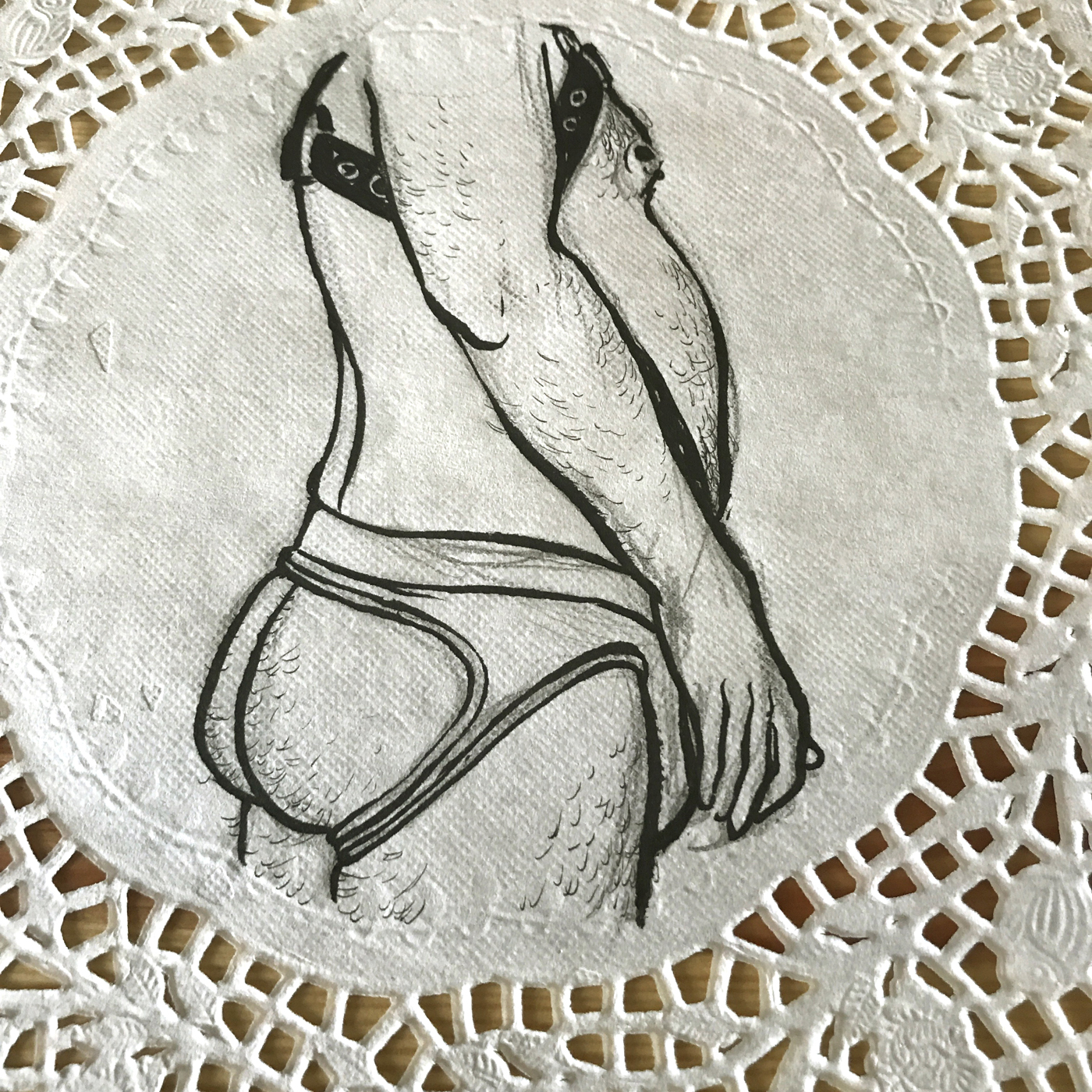 Fetish cub Pentel brushpen on paper doily. Original artwork.