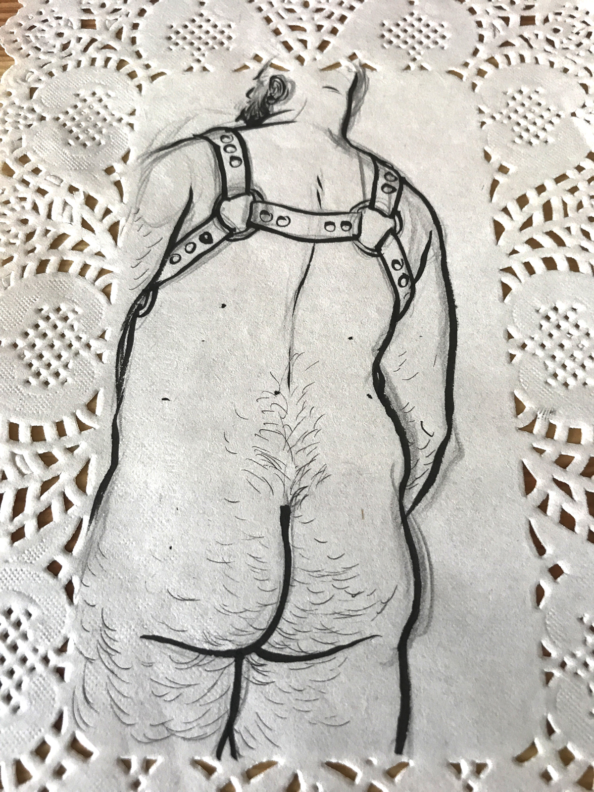 Fetish Bear. Pentel brushpen on paper doily. Original Artwork.