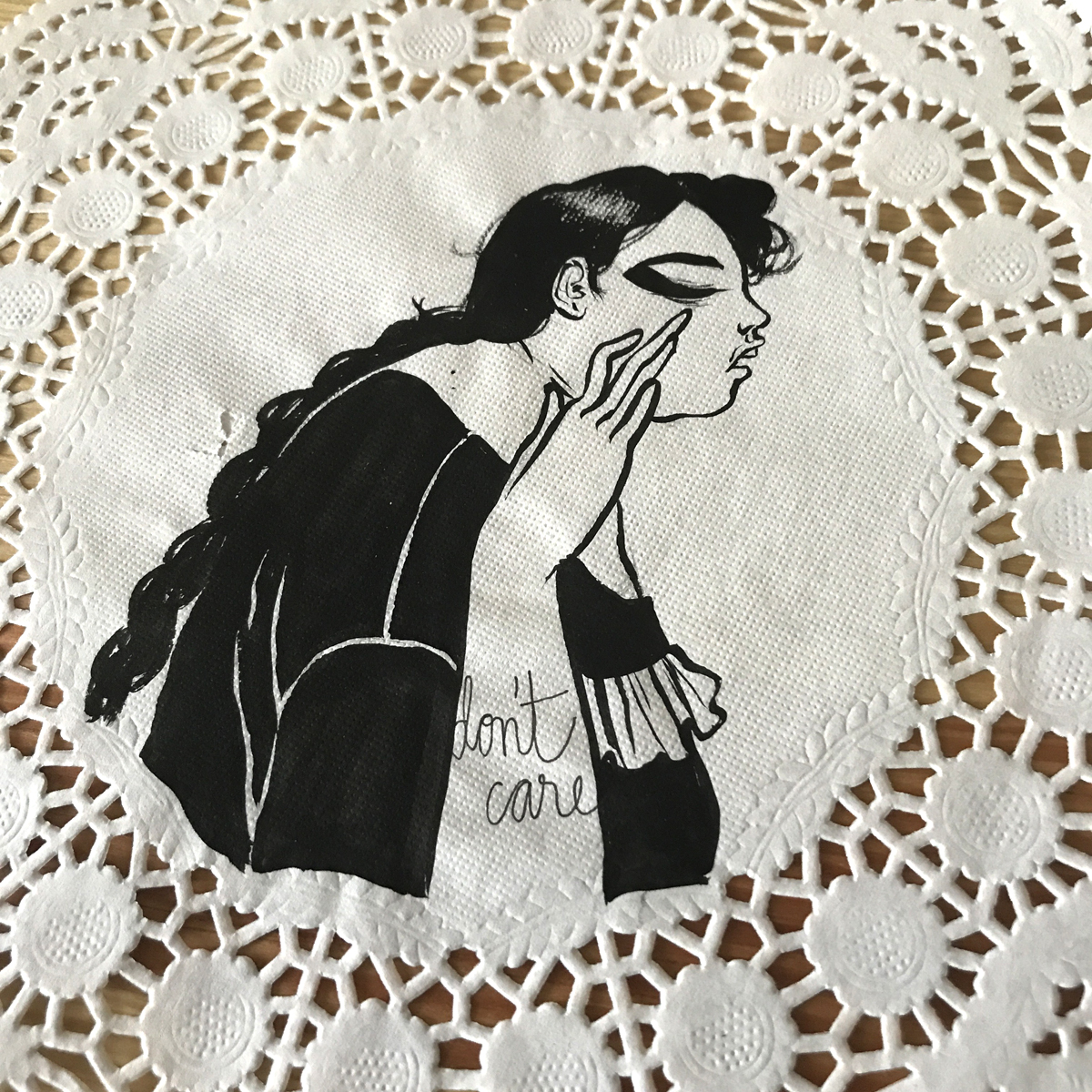 Don't Care. Pentel Brushpen + micron on paper doily. Original artwork.