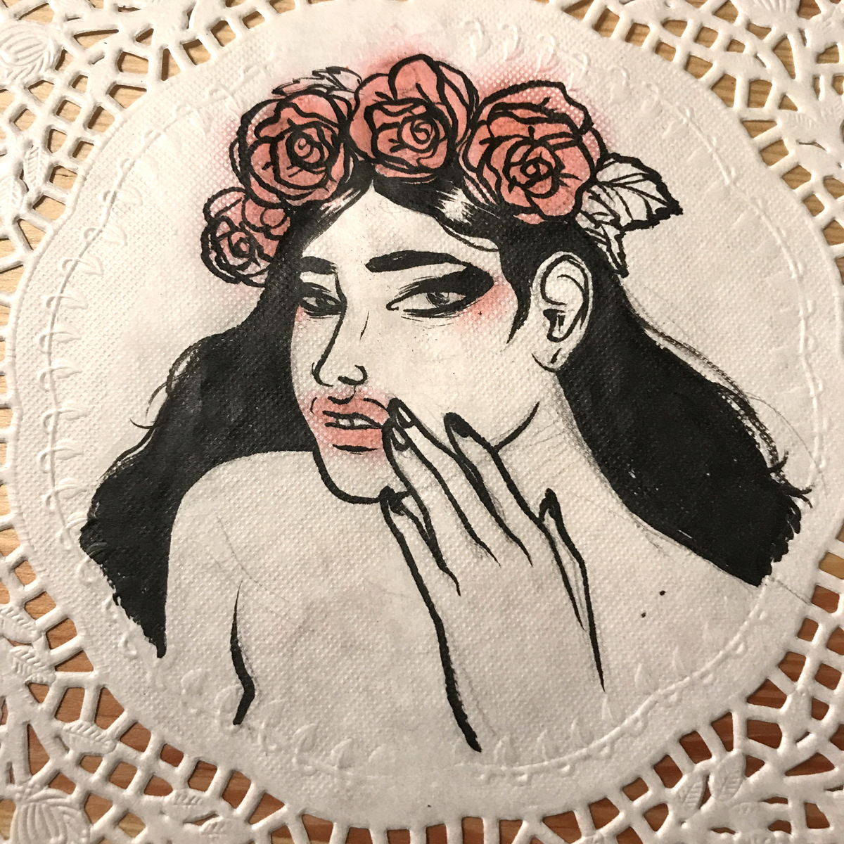 Woman with roses in hair. Pentel Brushpen + inkjet safe highlighter on paper doily. Original artwork.
