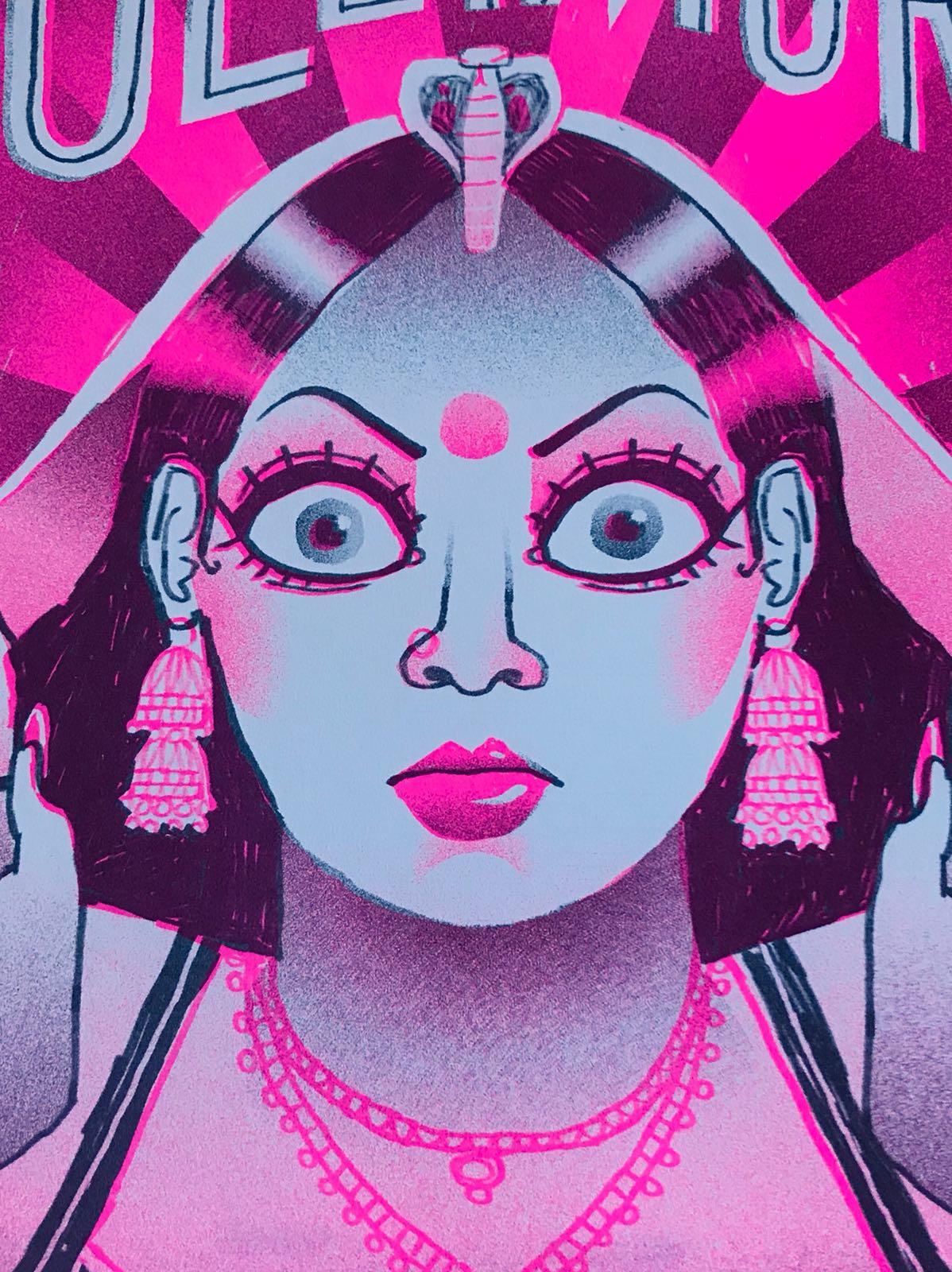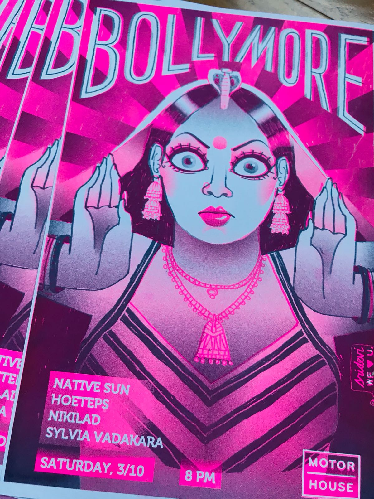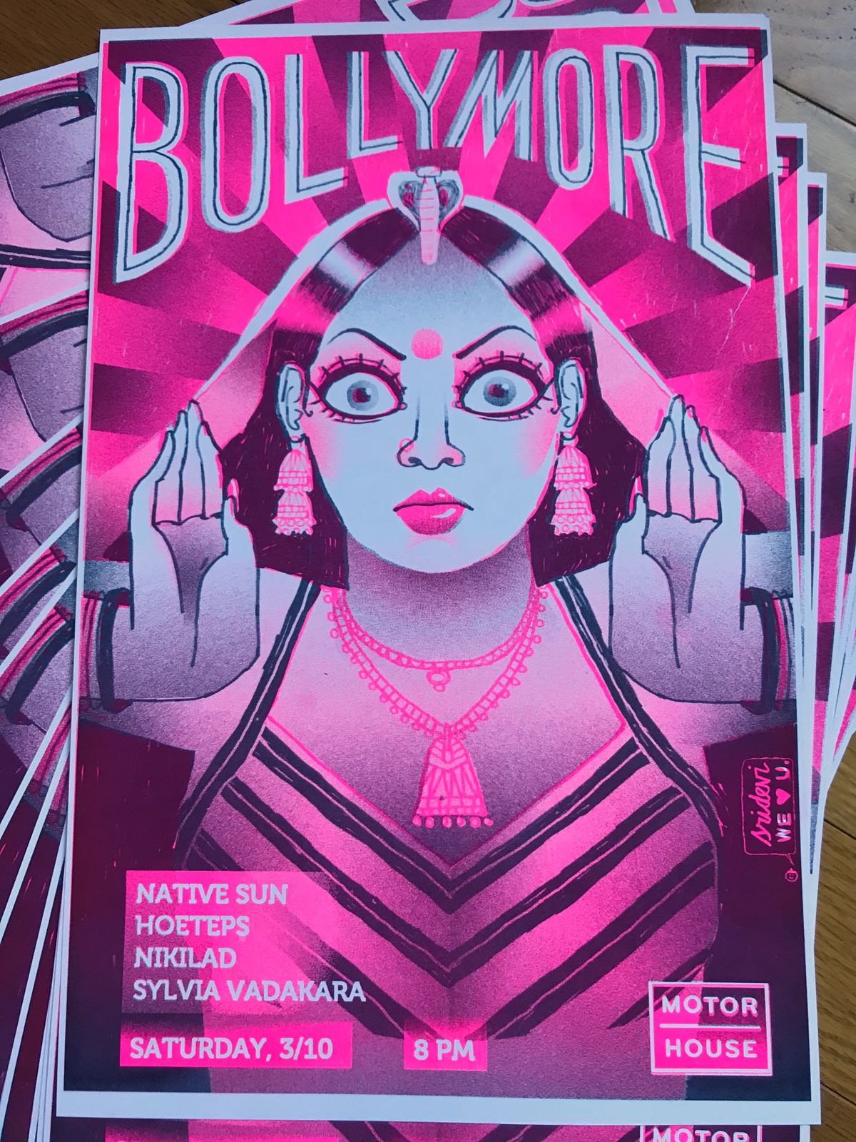 2 colour risograph poster in steel and Fluorescent pink for a Bollywood themed event in Baltimore.