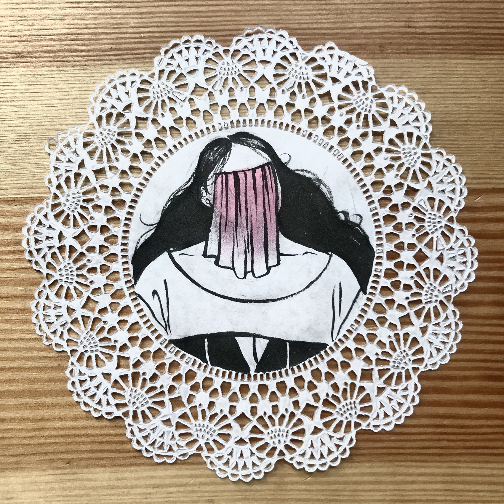 Pencil, ink and gel highlighter on doily 6 inch diameter Signed by the artist