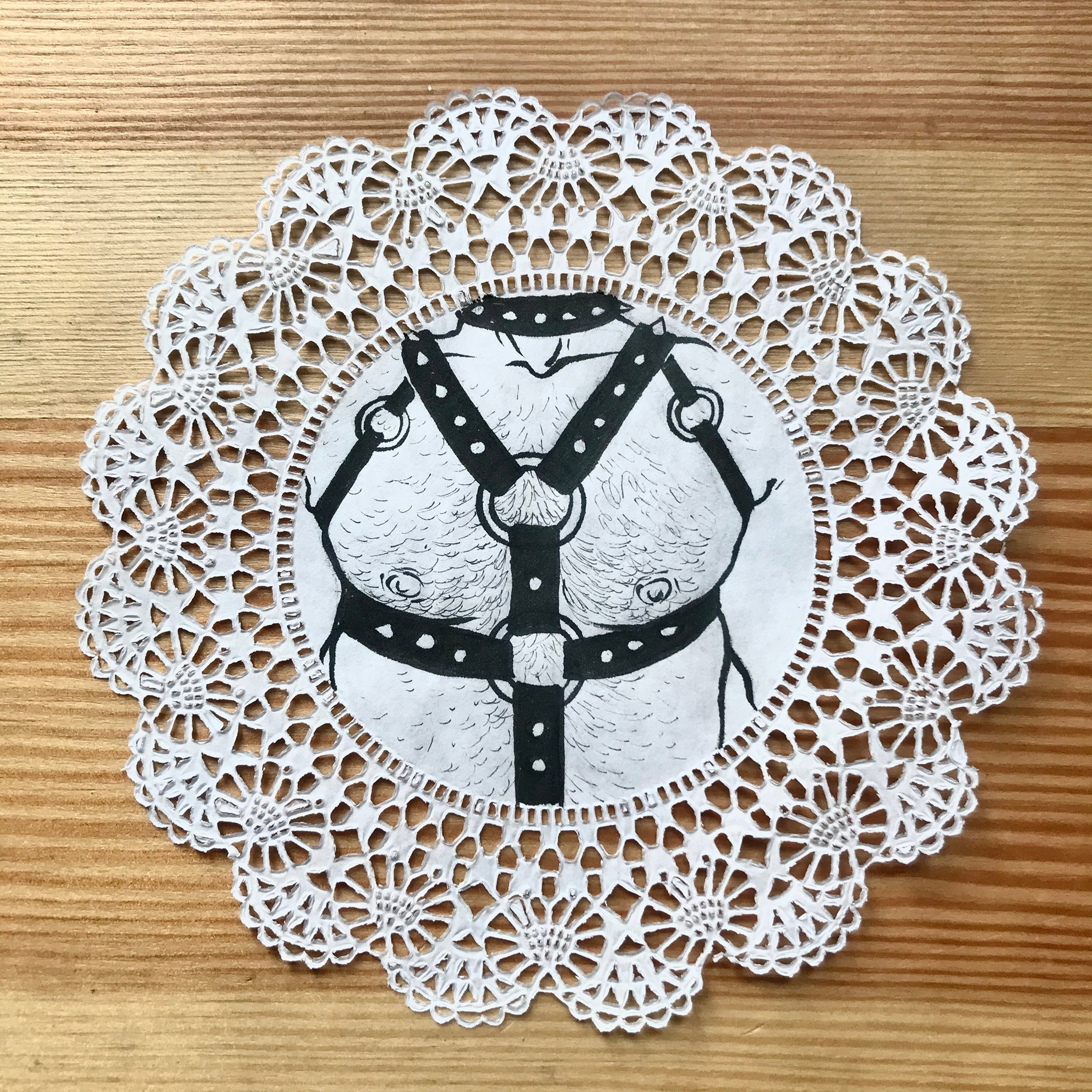 Pencil and ink on doily 6 inch diameter Signed by the artist