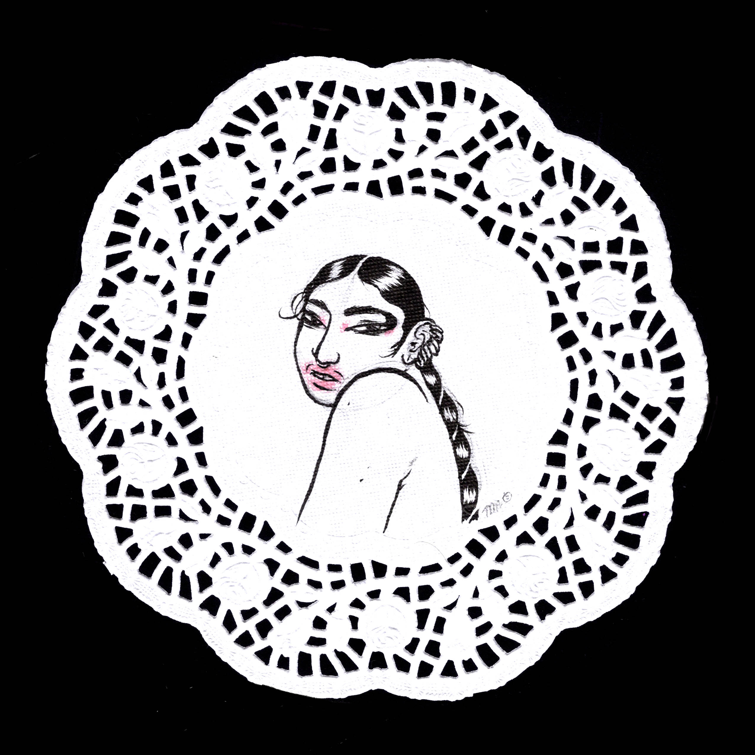 Pencil and ink on paper doily 7.5 inch diameter Signed by the artist Ships flat