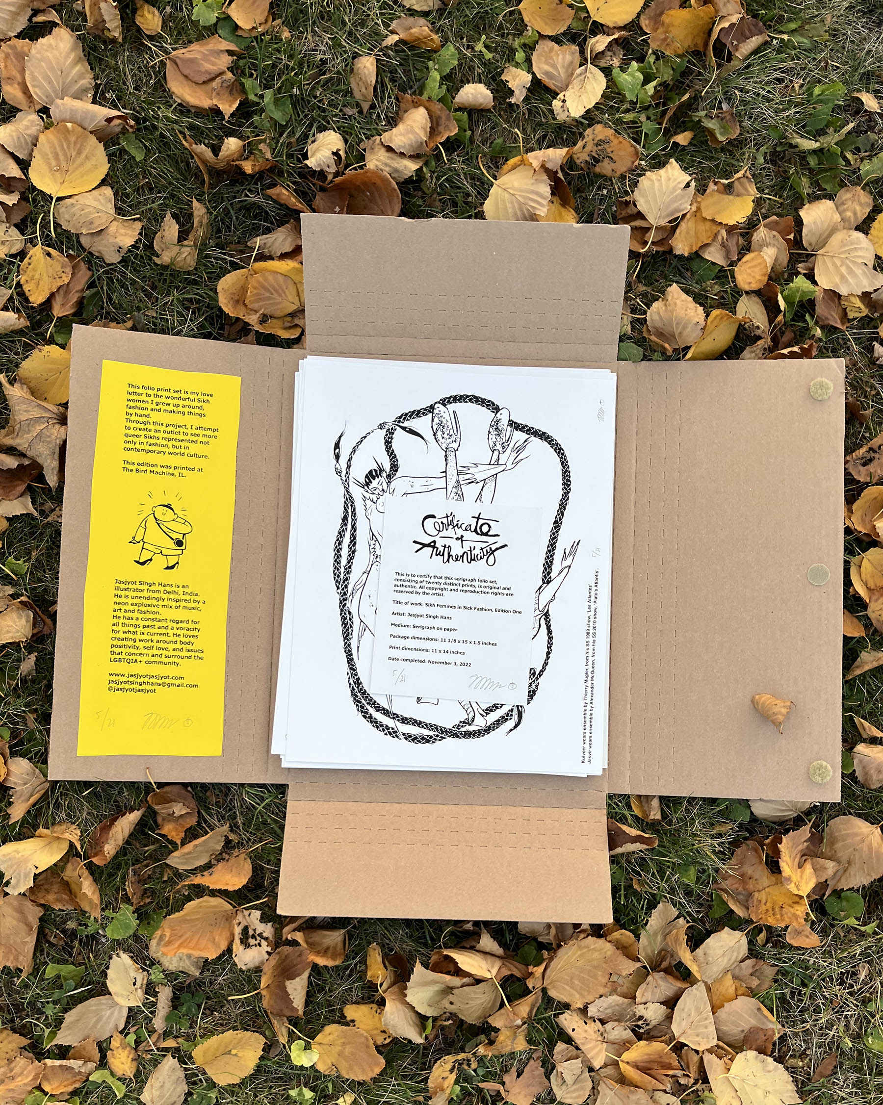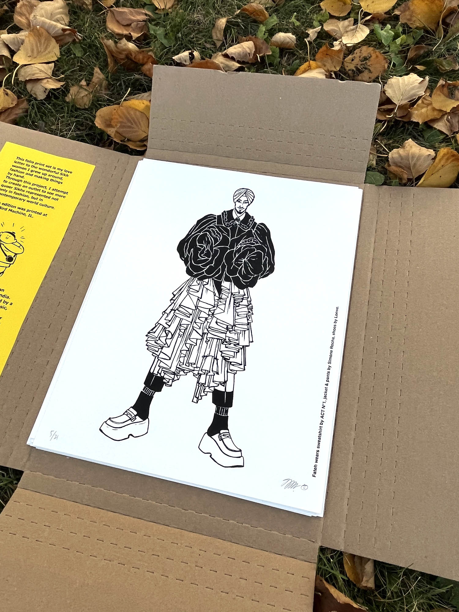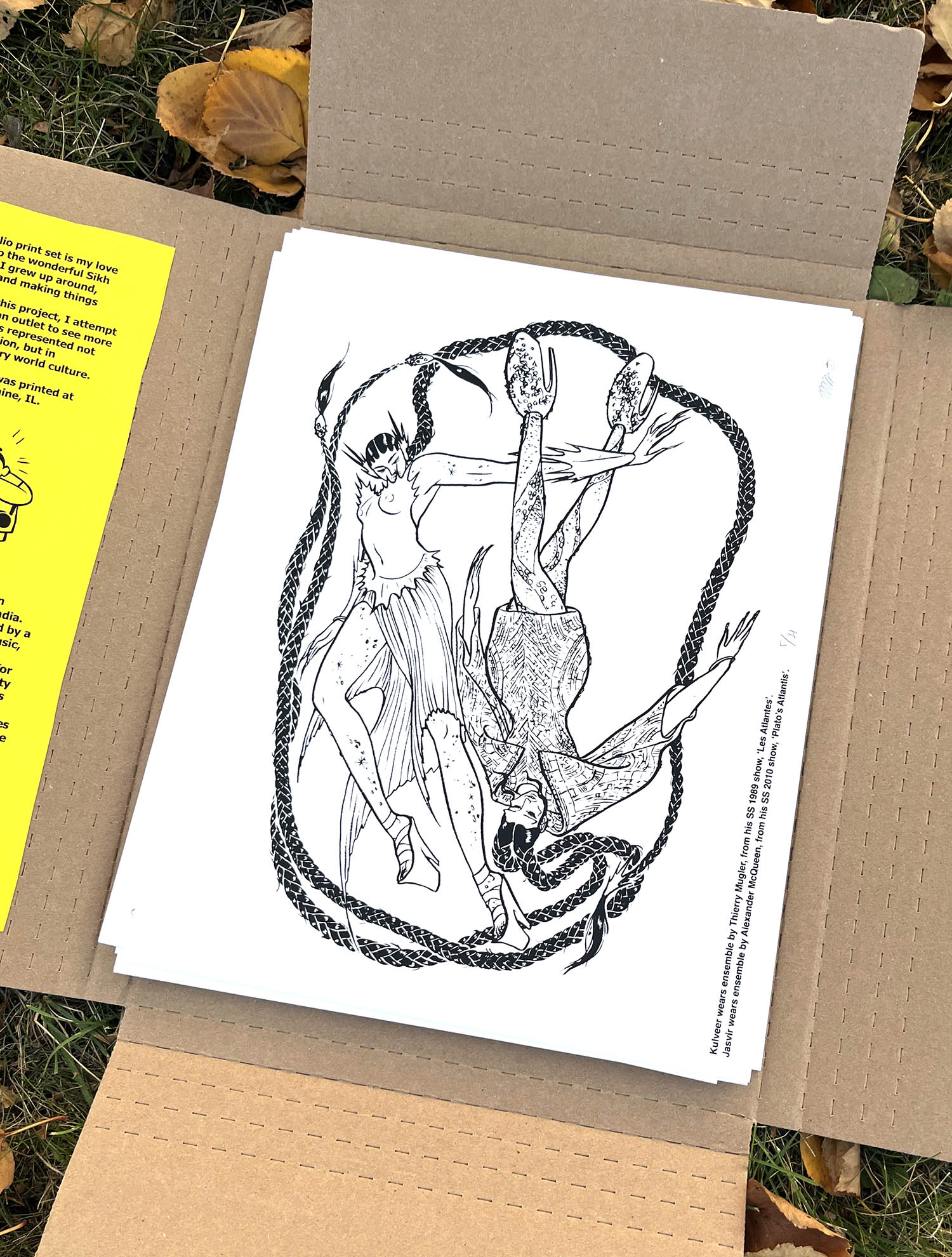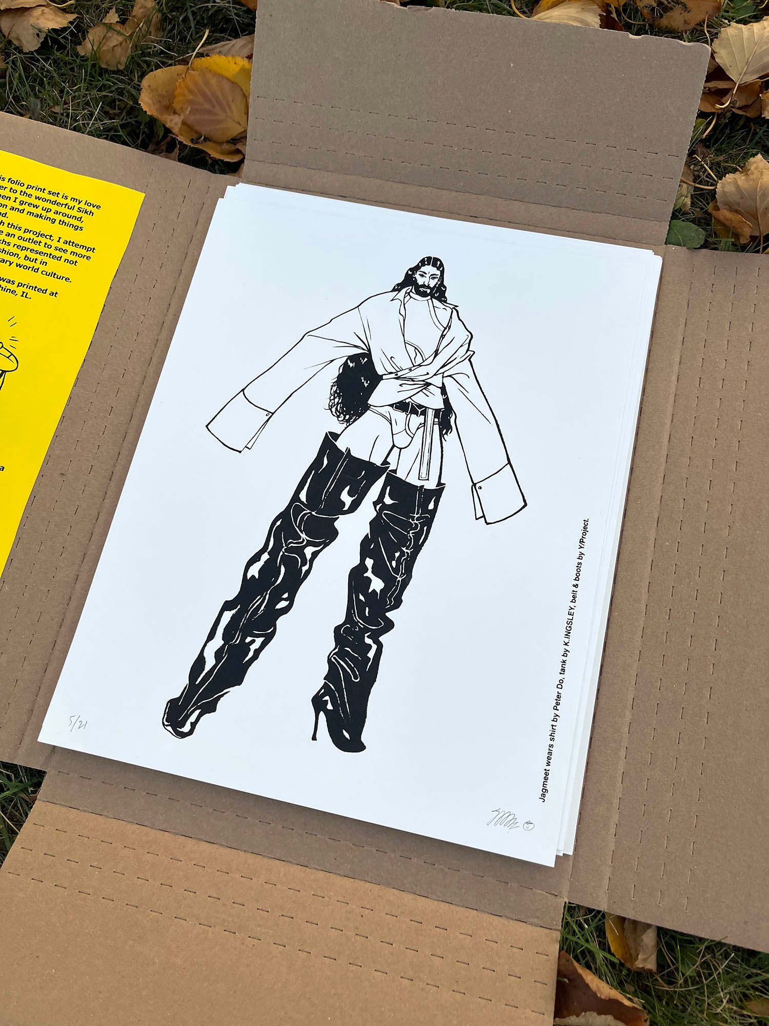 Sikh Femmes in Sick Fashion is a box set of 20 hand pulled screenprints featuring a fabulous ensemble of Sikh queer and femme characters dressed in the finest fashion!