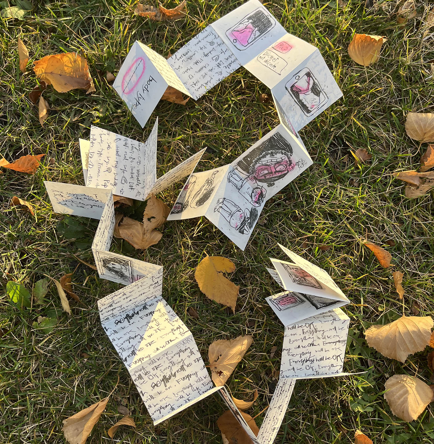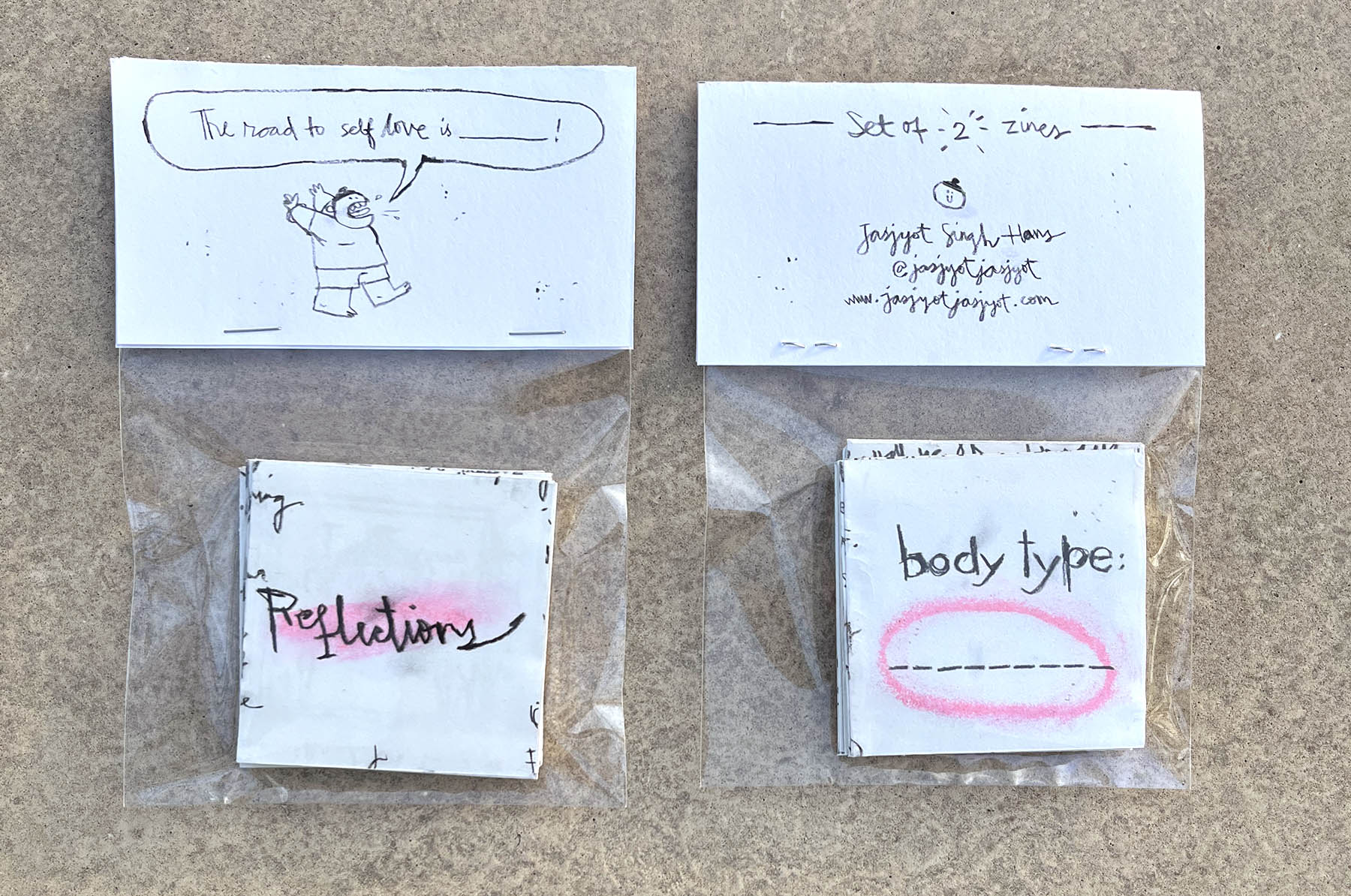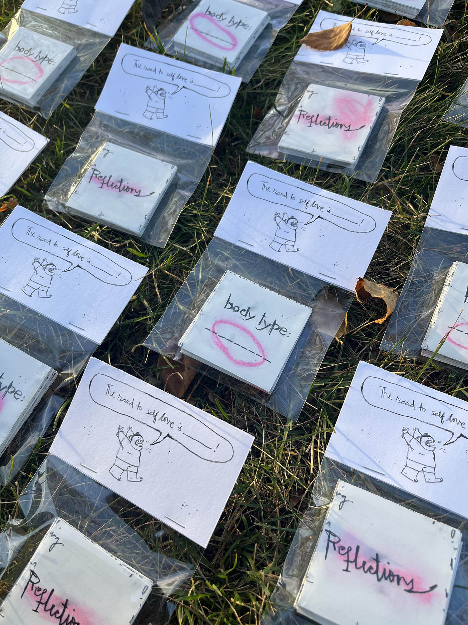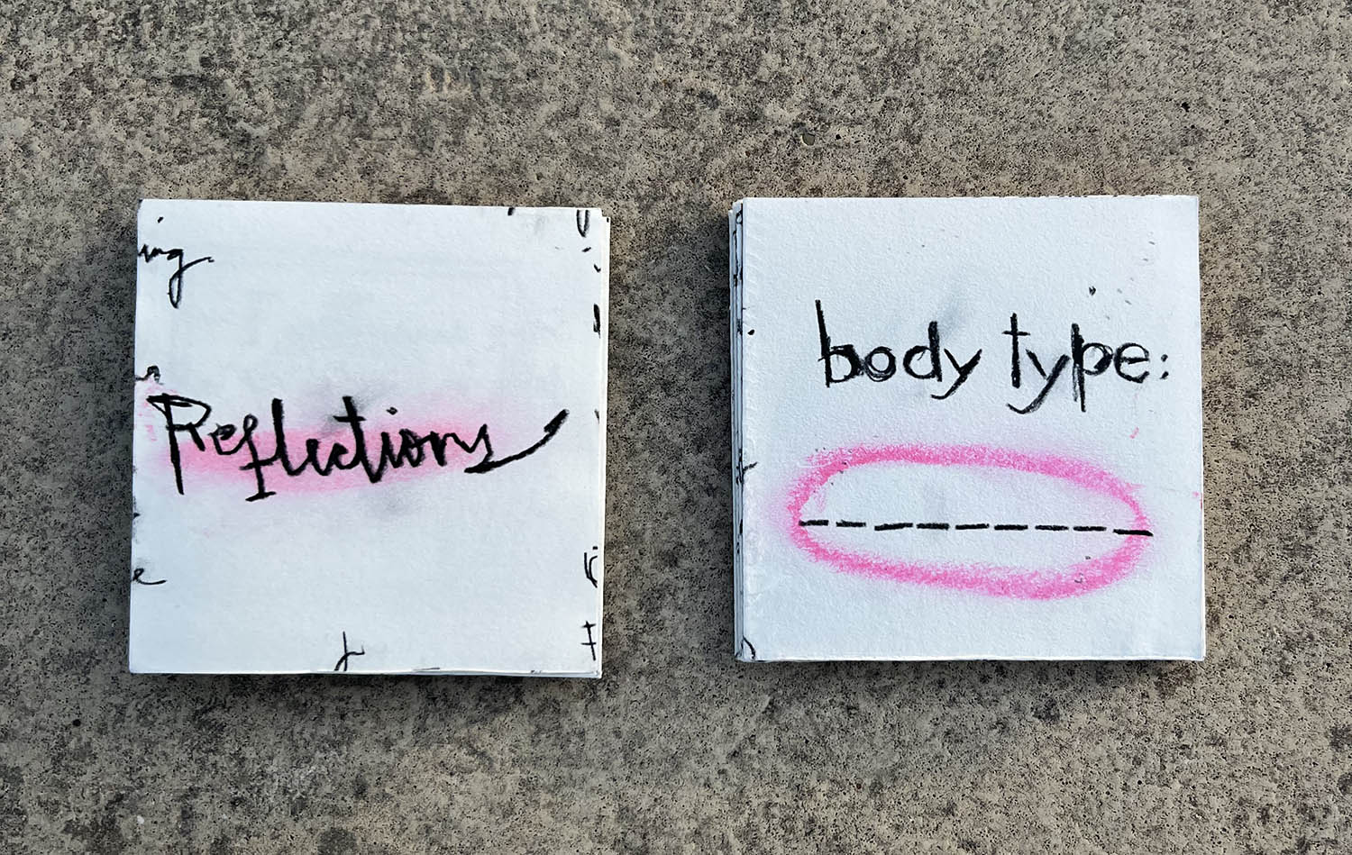A set of two single-sheet zines about body image and self love. While 'Reflections' looks within, with a gnawing sense of inadequacy, 'Body Type' is a journey through the virtual world of dating, body ideals, and is about finding peace within your own vessel, knowing it’s the only one you have.