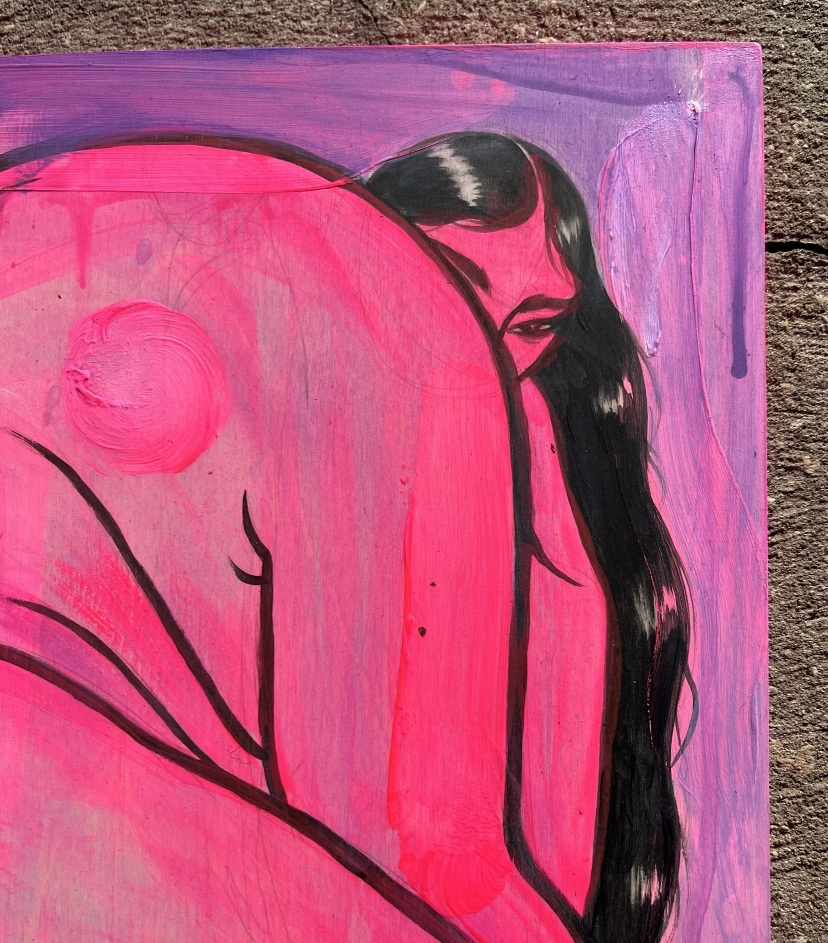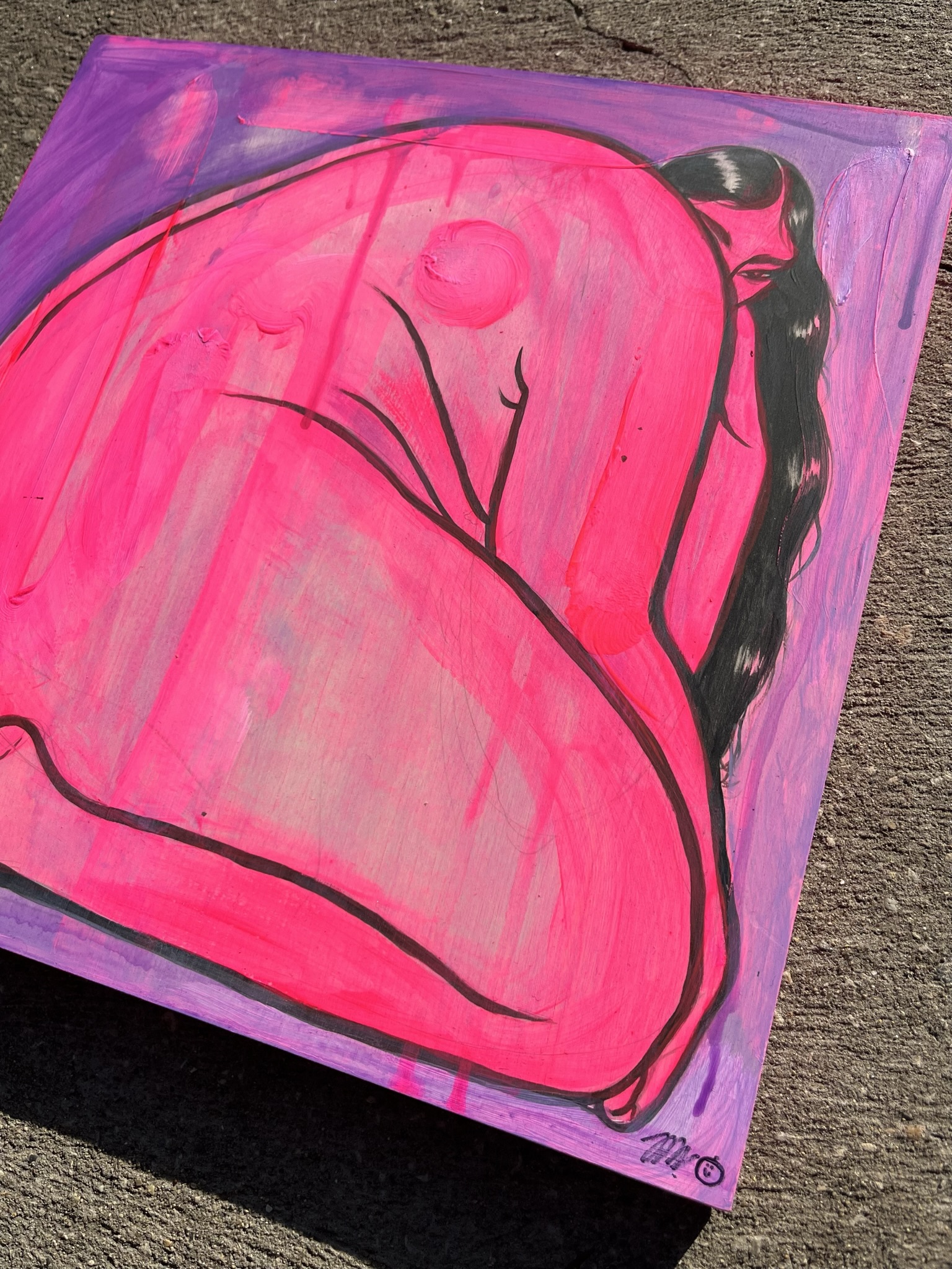 Pencil and acrylic paint on birch panel. Pink and lavender ombré painted edges. Signed by artist in the lower right corner.