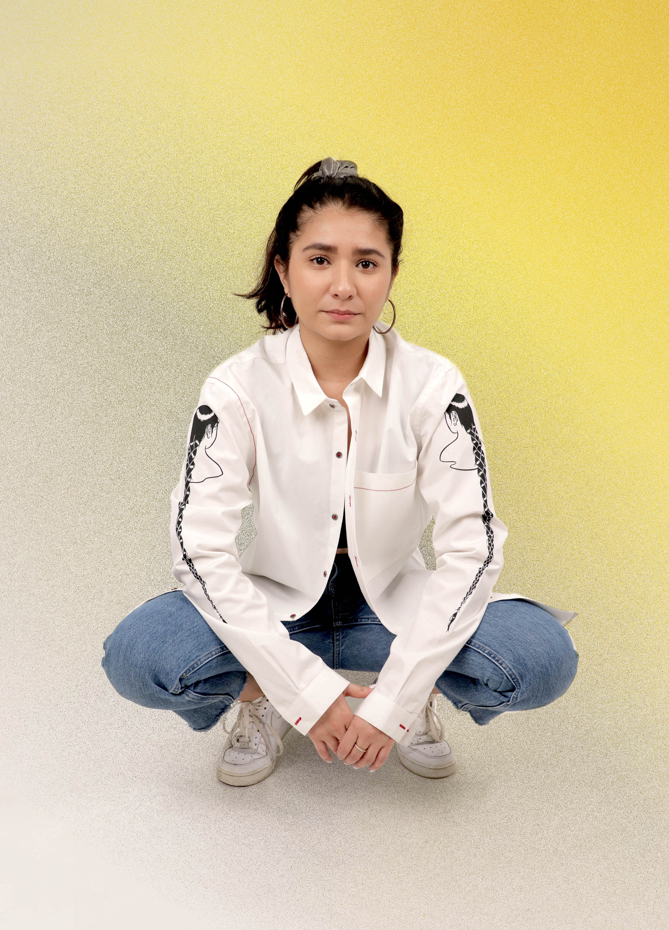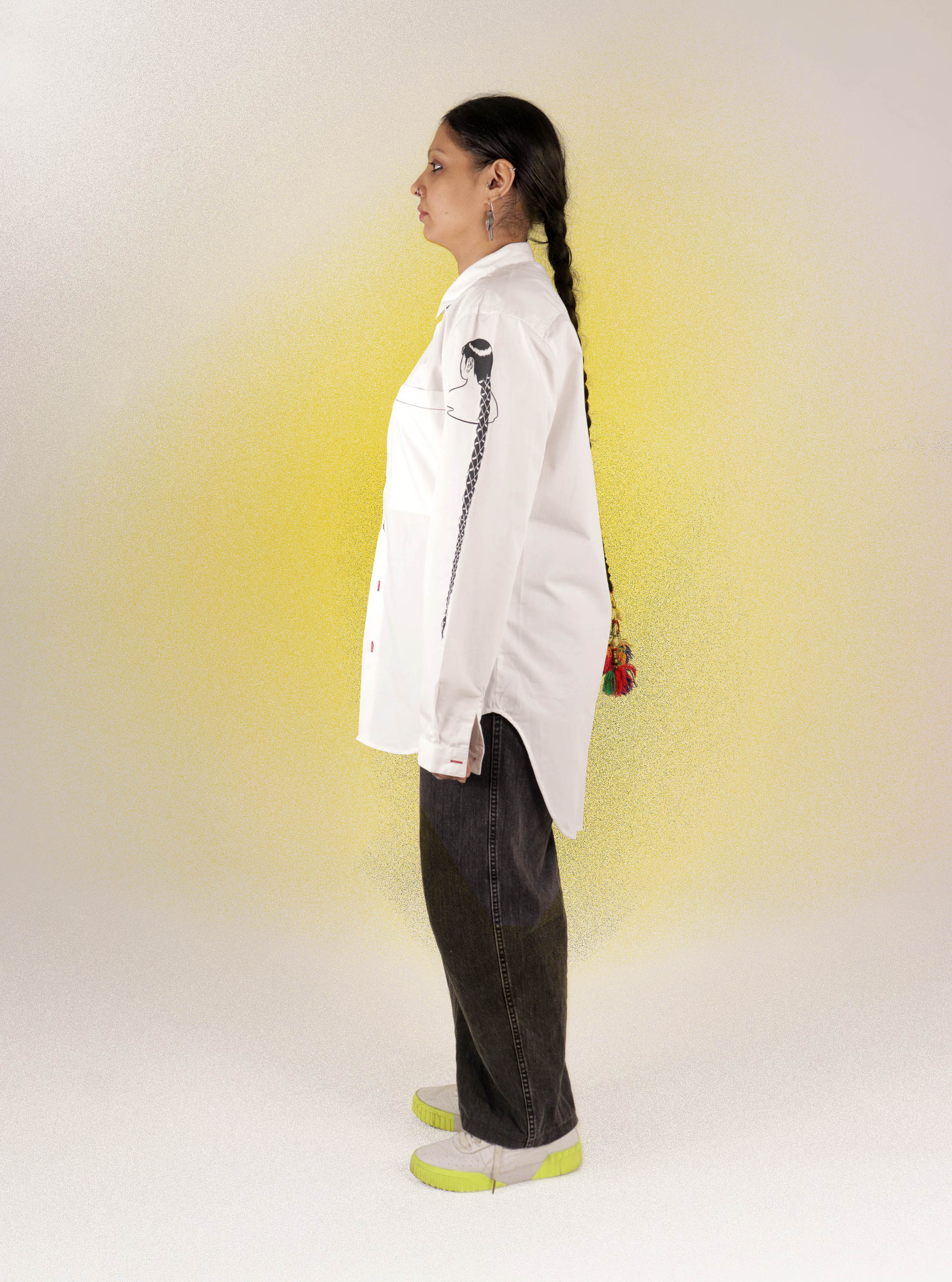 Crisp white shirt with screenprinted figures with braids running down the sleeves. Red thread detailing on the pocket + eyelets and metal buttons. A conversation starter everywhere you go!
