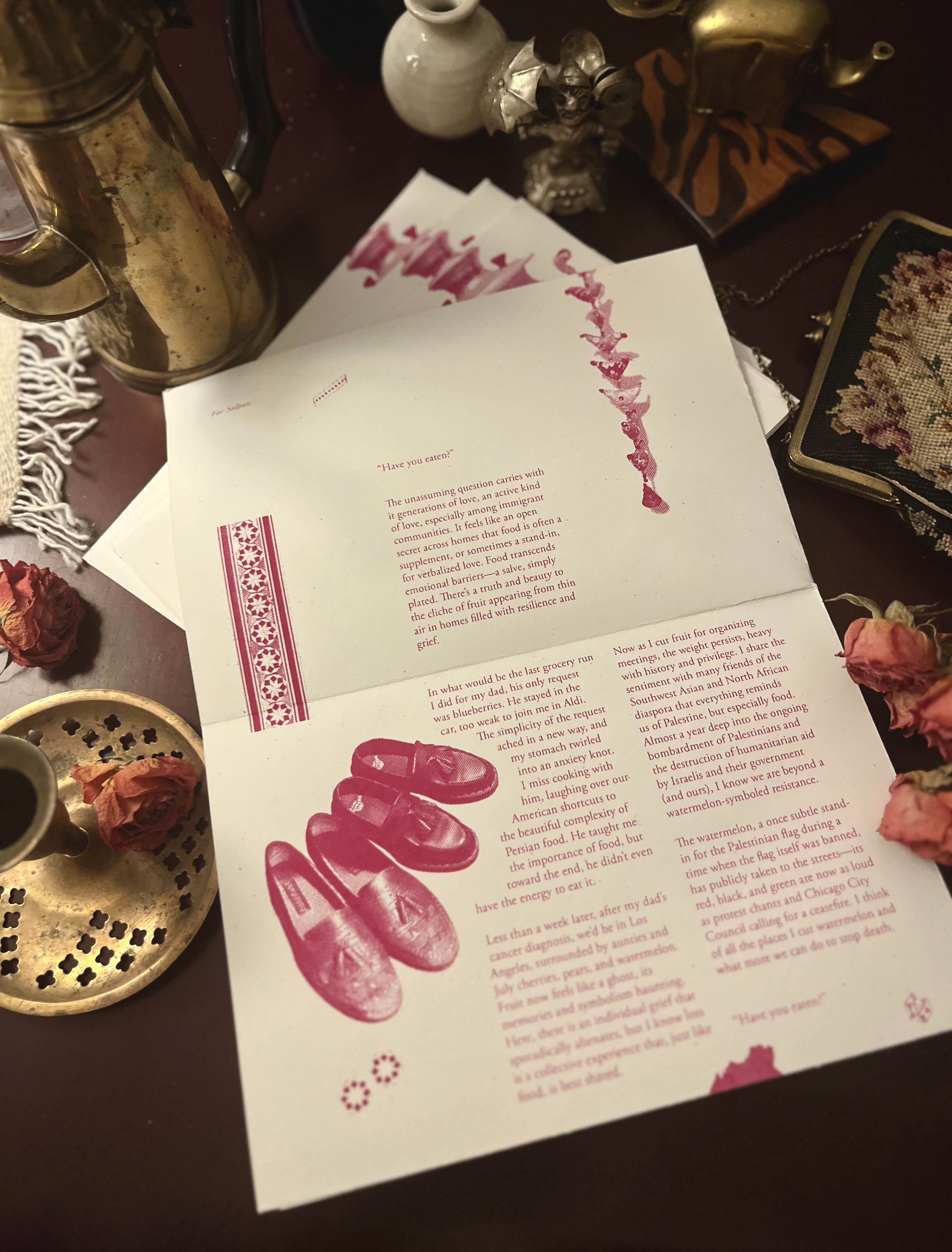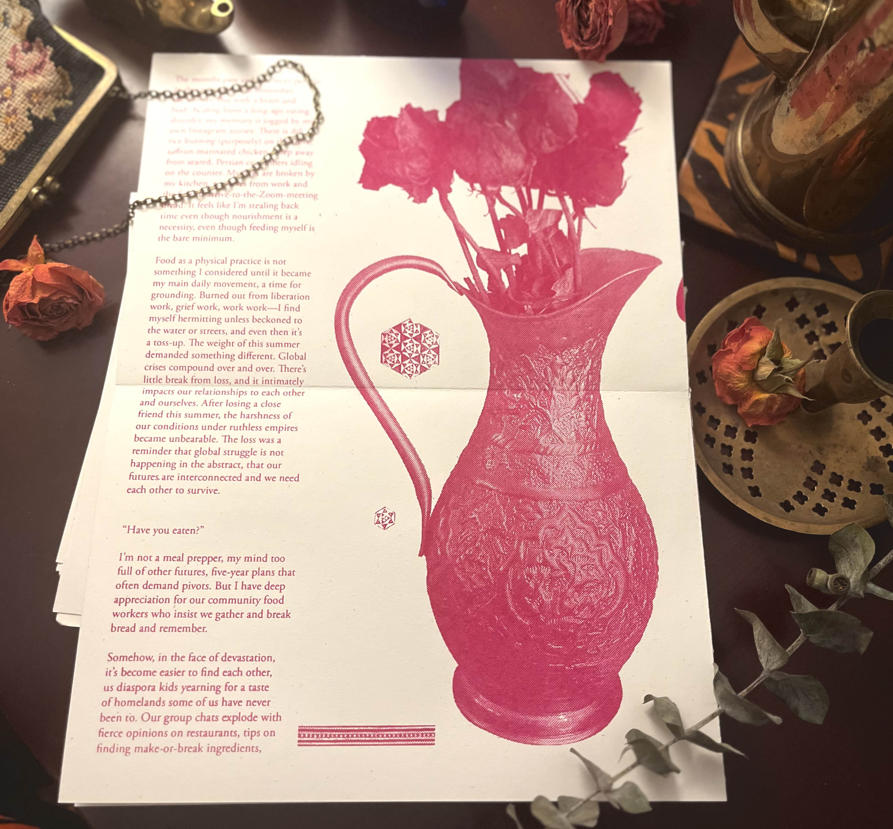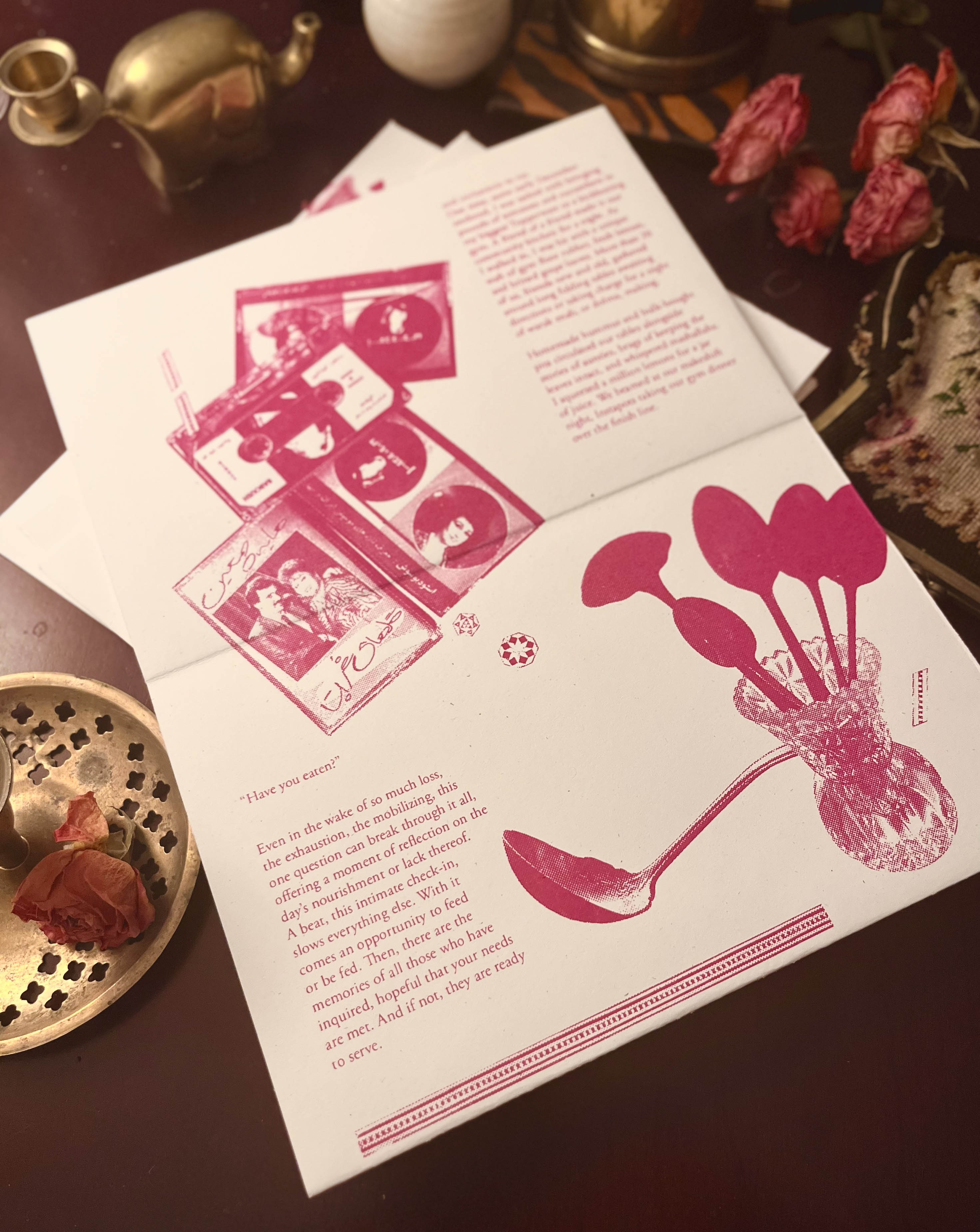 This 8-page zine is built from a single 18x24 inch sheet of Speckletone paper, and opens into a warm mess of collaged plates full of food and memories. On the other side, you'll find deft prose echoing the anthem "Have you eaten yet?" Steeped in nostalgia and community, this zine centers food-making and breaking as some of the fiercest action-oriented love across cultures.